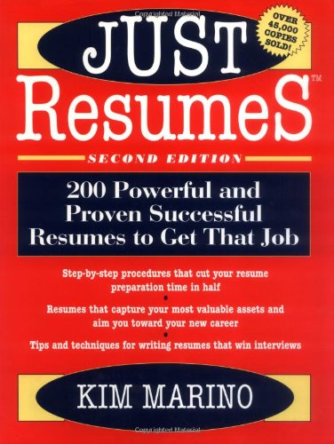 Resumes That Get Results! Thirty seconds. That's all it takes for your resume to be forwarded--or rejected. With such a short time to make a strong impression, you don't want to take any chances with this all-important marketing tool. The proven techniques in Just resumes will help you get your resume past the screening process and on to the interview you want! It will focus the interviewer's attention on your strengths, and give you full credit for all your achievements. Most importantly, it will help you see yourself in a more focused and positive manner. Written by Kim Marino--an outplacement specialist and founder of Just Resumes, a successful resume writing service--this concise and comprehensive guide is packed with everything you need to write an effective professional resume. Here's what you'll find: 200 resume samples from real clients who got real jobs! * Up-to-date information on resumes and the Internet--elements of electronic resumes, job postings on the Internet, and surfing job sites * Resume do's and don'ts--important facts to keep in mind * Tips on resume appearance--choosing the right typeface, paper, and length * Chronological, functional, or combination resumes--and advice on when to use what * Pointers for college students, recent graduates, people in the arts, those returning to the workforce, and professionals making a lateral change or moving up